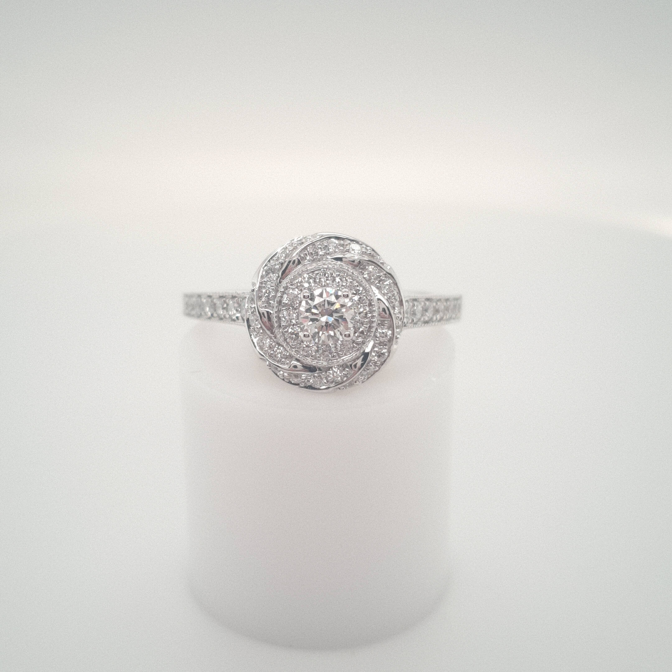 Centre Brilliant cut Diamond is surrounded by 2 halo’s of Diamonds, one of which has a slight twist giving this ring a very unique quality.
