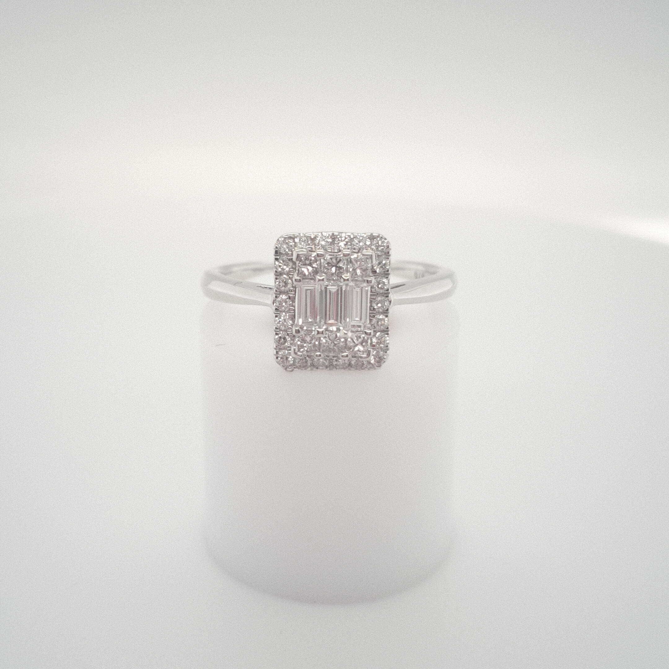 The centre of this ring has 3 Baguette Diamonds and 6 Brilliant cut Diamonds surrounded by a Halo of smaller Brilliant cut Diamonds.