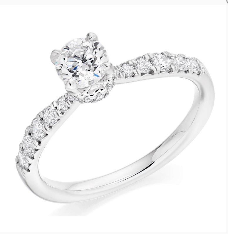 Platinum Solitaire Diamond Ring with Diamond Shoulders. Centre Diamond set in a 4 claw setting which is also surrounded by a beautiful circle of Diamonds underneath the centre stone.