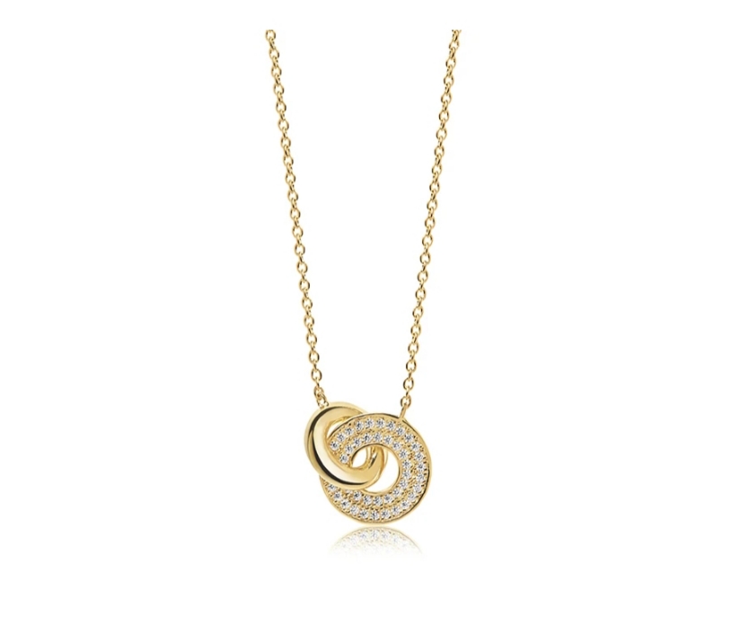 Double Circle Pendant made of 18 karat gold plated on 925 Sterling silver, polished surface and facet cut white zirconia.